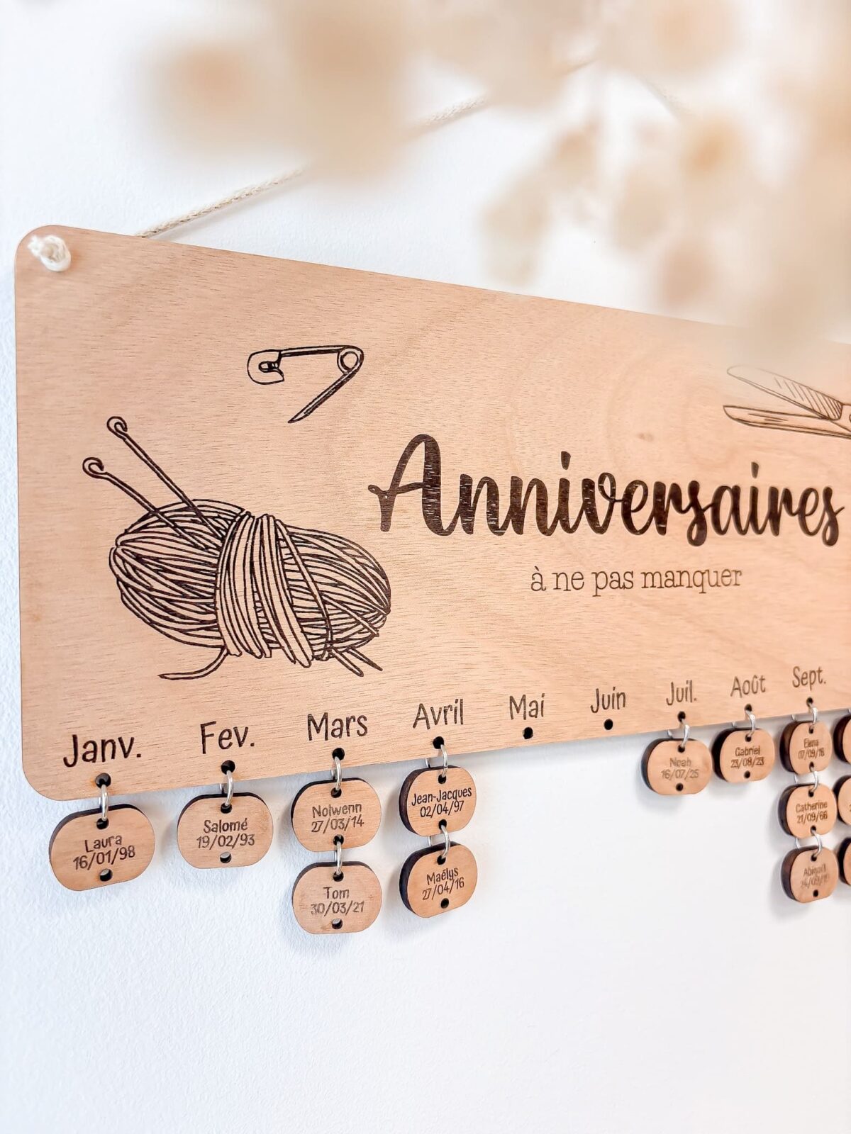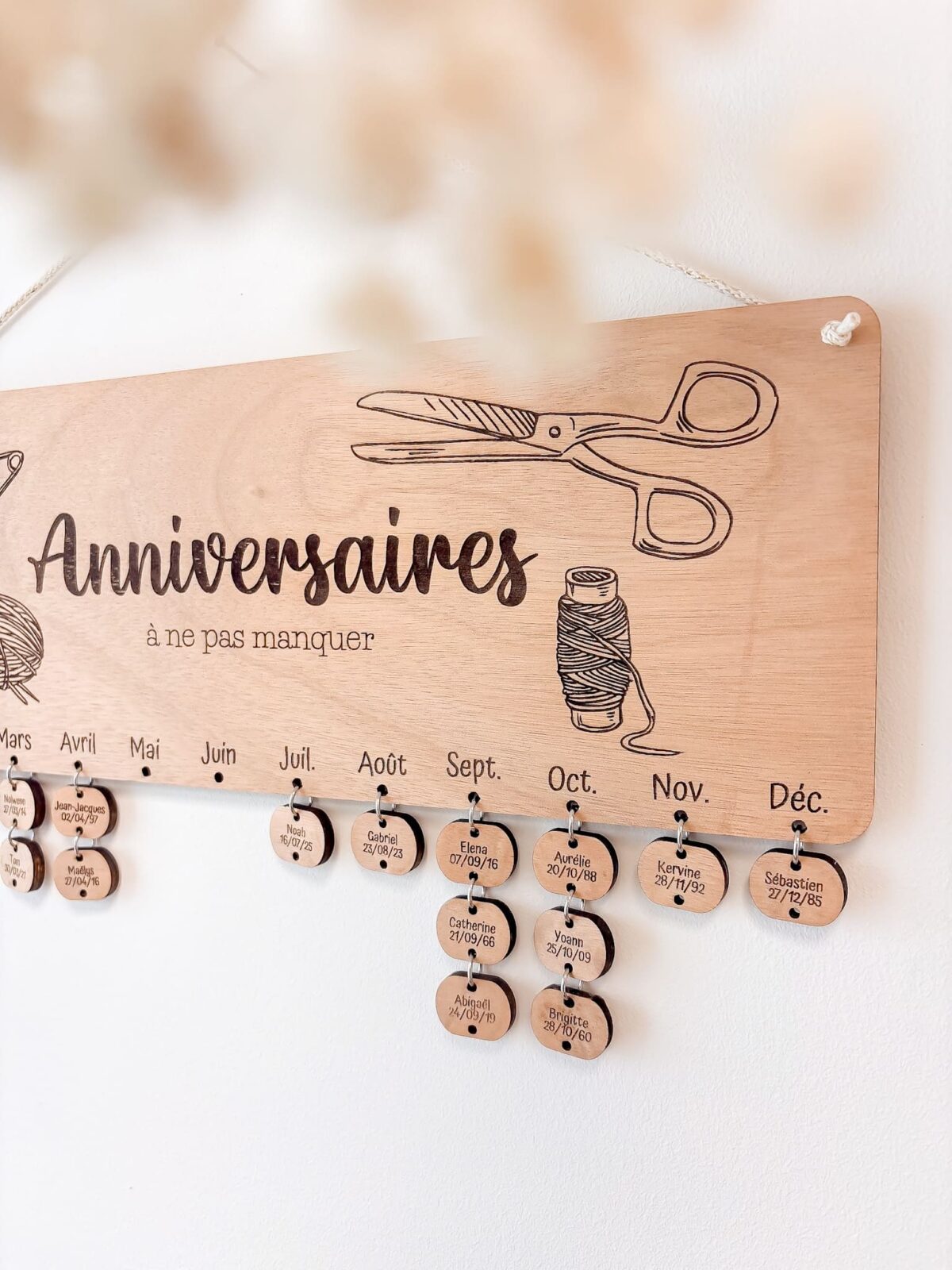 Ce calendrier d’anniversaire en bois est l’accessoire idéal pour ne plus oublier les dates d’anniversaire de vos proches. Fabriqué artisanalement avec une machine laser, il allie esthétique, praticité et personnalisation. Chaque prénom est suspendu sous le mois correspondant, pour une vue claire et élégante de l’année.