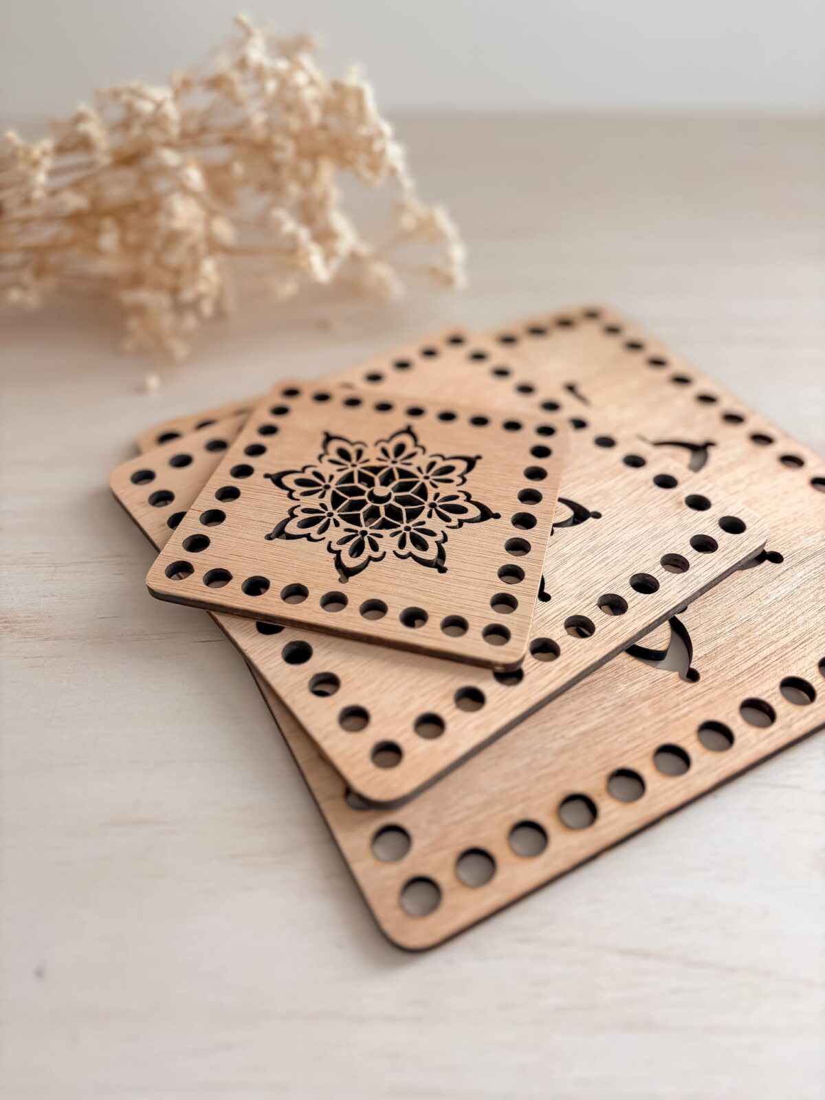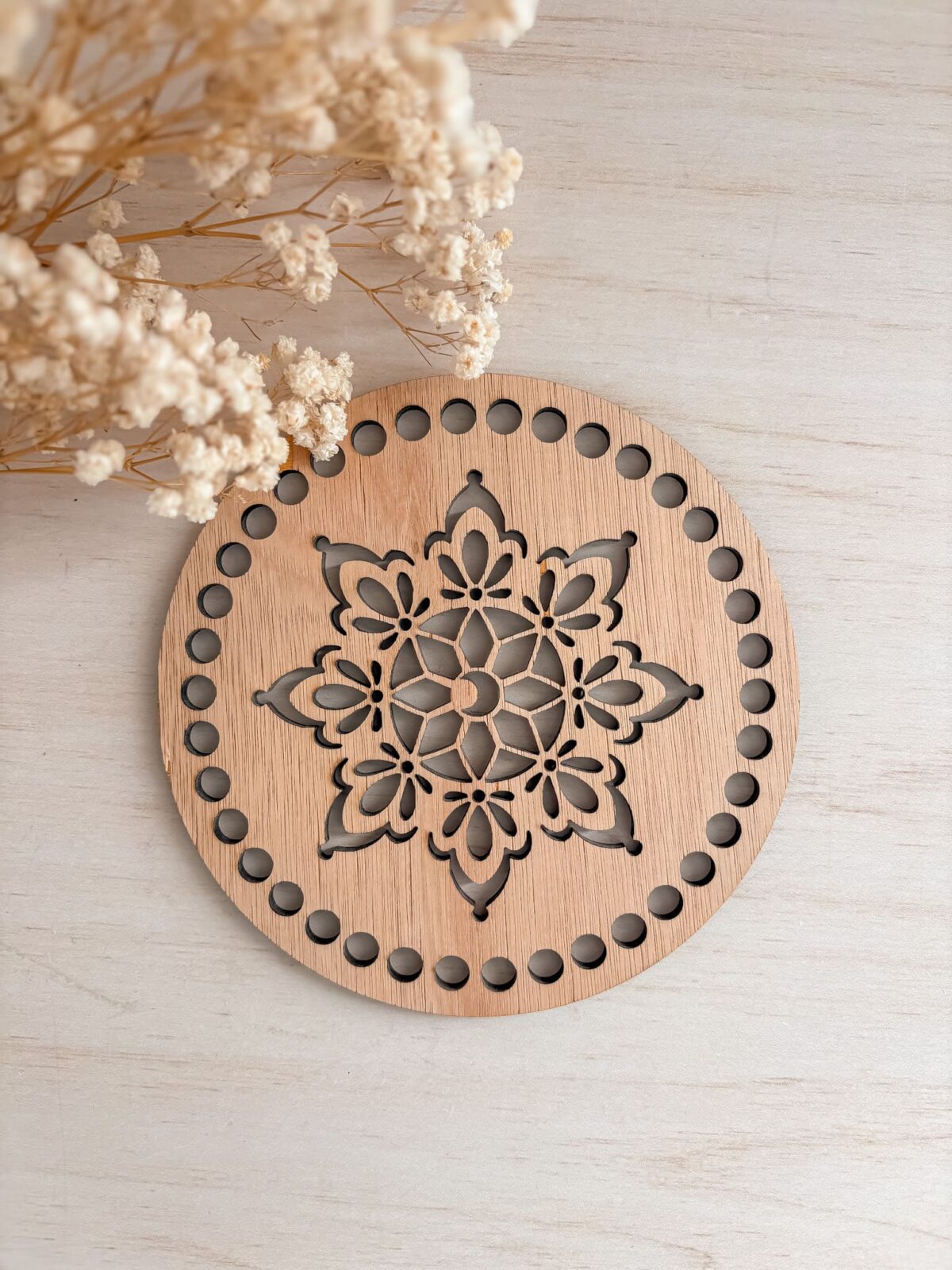 Sublimez vos paniers et sacs au crochet avec le couvercle et fond ajouré en bois. Conçus pour apporter une structure impeccable et un design unique, ces accessoires se distinguent par leurs motifs Mandala et Lune découpés avec précision dans la masse. »