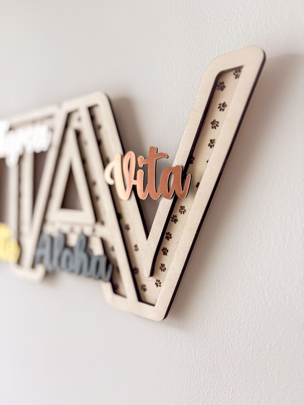 La force de cette décoration murale réside dans le mariage du matériau : la chaleur du bois pour la base de la grande lettre, et l’éclat moderne du plexi couleur pour le prénom ou le motif de finition. C’est moi qui réalise la découpe au laser avec une grande précision, ce qui garantit un rendu 3D parfait pour chaque lettre.
