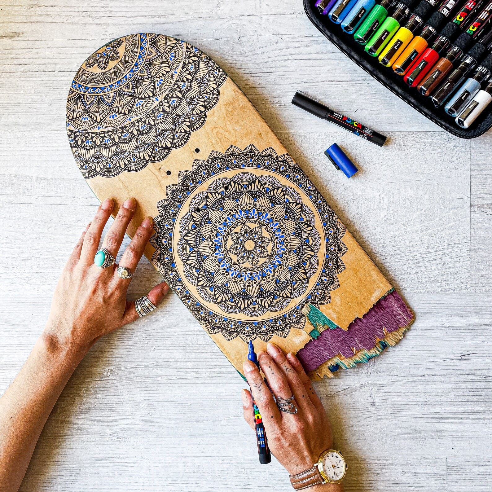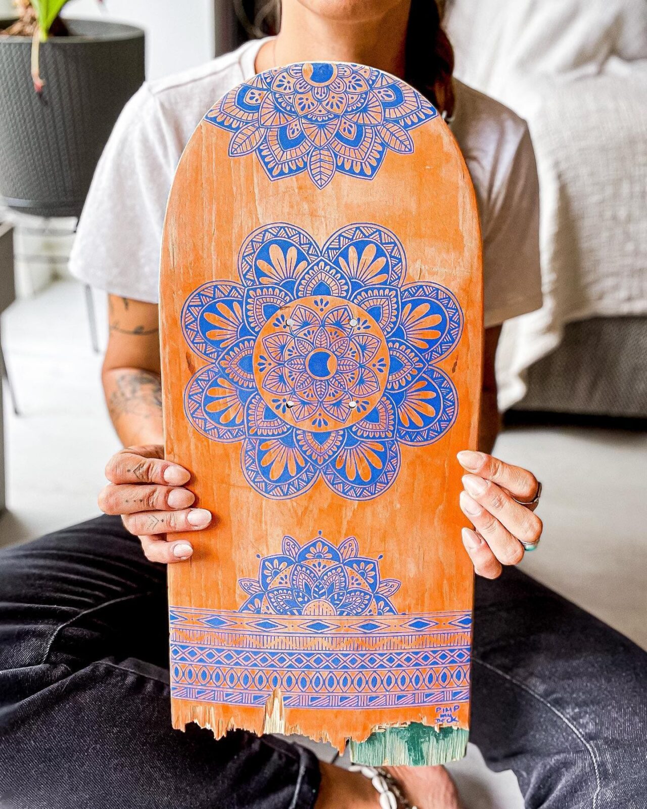 La planche de skate a été utilisée par un skateur du coin, usée et cassée. Je lui donne une seconde vie pour habiller vos murs. La planche a été poncée au préalable, avant de dessiner, à main levée le mandala. Les mandalas sont issus de mes créations personnelles. Aucune reproduction autorisée et modèle unique.